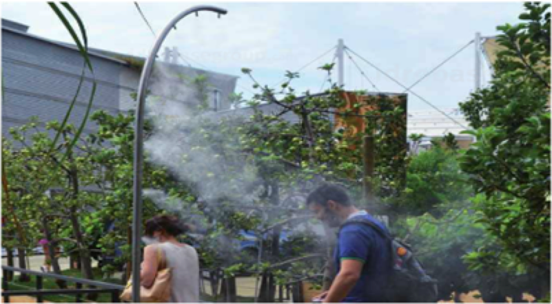 在一些步行街、公交站台都有有一些一个类似淋浴花洒的龙头正对着地面的一面,喷出凉飕飕的雾气。可别小看了类似淋浴花洒的龙头,每天上午8 点到下午 5 点,只要是有太阳的大热天,它们都会自动喷出细细的水雾,为过往路人带来丝丝凉爽。